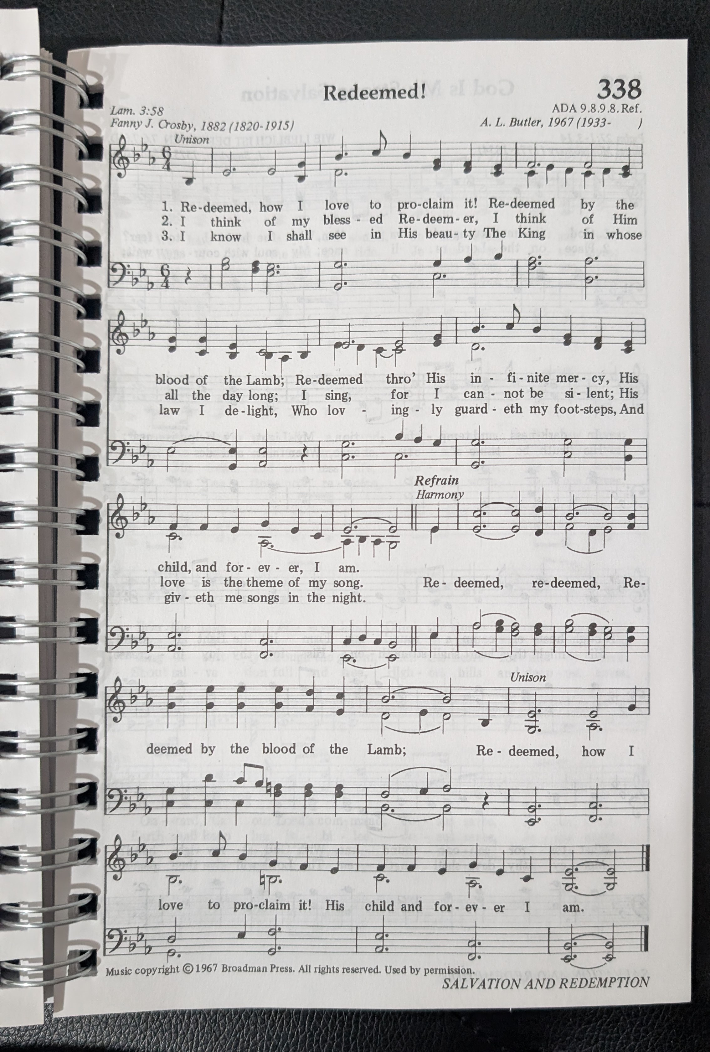 So Faith and I began to sing “Redeemed”, hymn 338 in the Adventist hymnal. Shortly after we started the song, Faith pulled out her phone to record our harmony. I smiled and gave a “peace” sign to the camera as we continued to sing.
