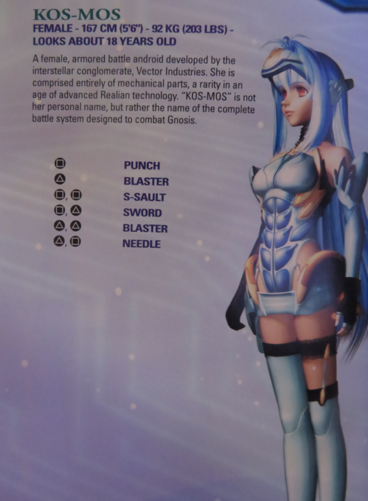 KOS-MOS, on the other hand, is an android AI, built with weapons and super powers used to fight the monster alien race of the game: the gnosis. Shion – and another character who died 3 years earlier, but oh wait, he’s not dead, but oh wait, yes he is – is the primary engineer credited for the creation of KOS-MOS, and Xenosaga at its core, in the midst of the several other complex stories and characters, explores the growing relationship between the two.